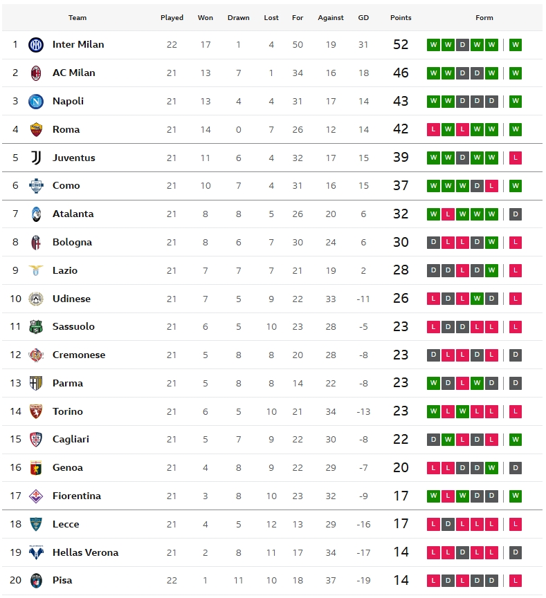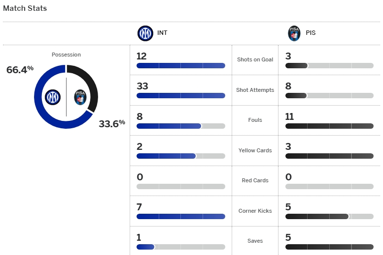 อินเตอร์ มิลาน ยังคงแข็งแกร่งในเกมลีก เมื่อทำสถิติไม่แพ้ใครมาเป็นเกมที่ 10 ติดต่อกันแล้ว แม้โดนรองบ๊วยอย่าง ปิซ่า บุกมาเซอร์ไพรส์นำก่อนถึง 2-0 แต่พวกเขามายิงคืนหกเม็ดรวดจาก ปิโอเตอร์ เซียลินสกี้, เลาตาโร่ มาร์ติเนซ, ฟรานเชสโก้ ปิโอ เอสโปซิโต้, เฟเดริโก้ ดิมาร์โก้, อ็องเช่ บอนนี่ และ เฮนริค มคิทาร์ยาน แซงชนะไป 6-2 พร้อมทำแต้มหนีห่าง เอซี มิลาน เป็น 6 คะแนนแล้ว
