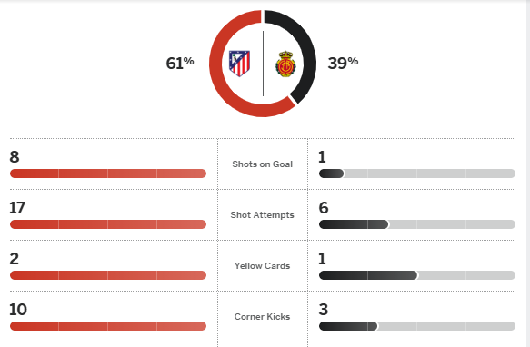 แอตเลติโก้ โจมตีด้วยทุ่มไกลแนวรับ มาญอร์ก้า สกัดไปเข้าทาง มาญอร์ก้า ยิงสวนหน้าเขตโทษ โรมัน ปิดทิ้งเข้าทาง ซอร์ลอธ ซ้ำจาก 6 หลาใส่ประตูโล่งๆ ขึ้นนำ 1-0
