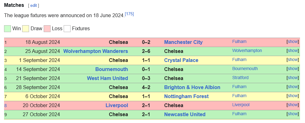 | 9 | Chelsea | 9 | 4 | 2 | 3 | 17 | 11 | 6 | 14 |