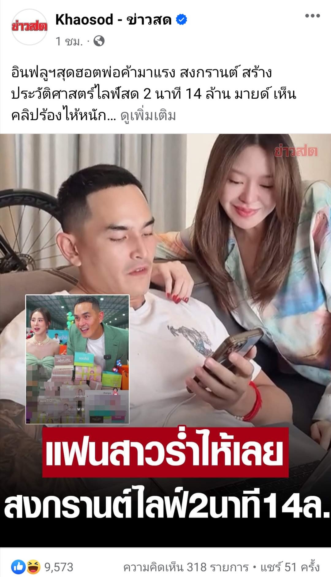 สงกรานต์​ สร้างประวัติศาสตร์​ไลฟ์สด​ 2นาทีได้​ 14ล้าน​ มายด์​แฟนสาวเห็นคลิป​แล้ว​ร้องไห้​หนัก​มาก​