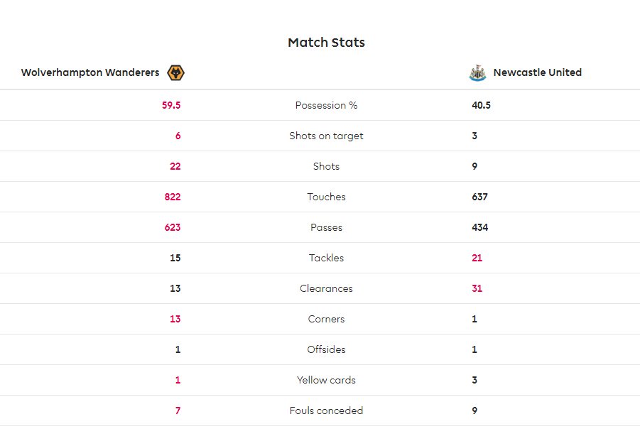 วูล์ฟส์เริ่มเกมครองบอลและเล่นได้ดีกว่าแต่หลังจากนั้นนิวคาสเซิลเริ่มตั้งเกมได้และสู่ได้ดีทำให้มีโอกาสลุ้นประตูกันทั้งสองฝั่งแต่สุดท้ายก็ยังไม่คมพอทำให้จบครึ่งแรกยังเสมอกันแบบไร้สกอร์