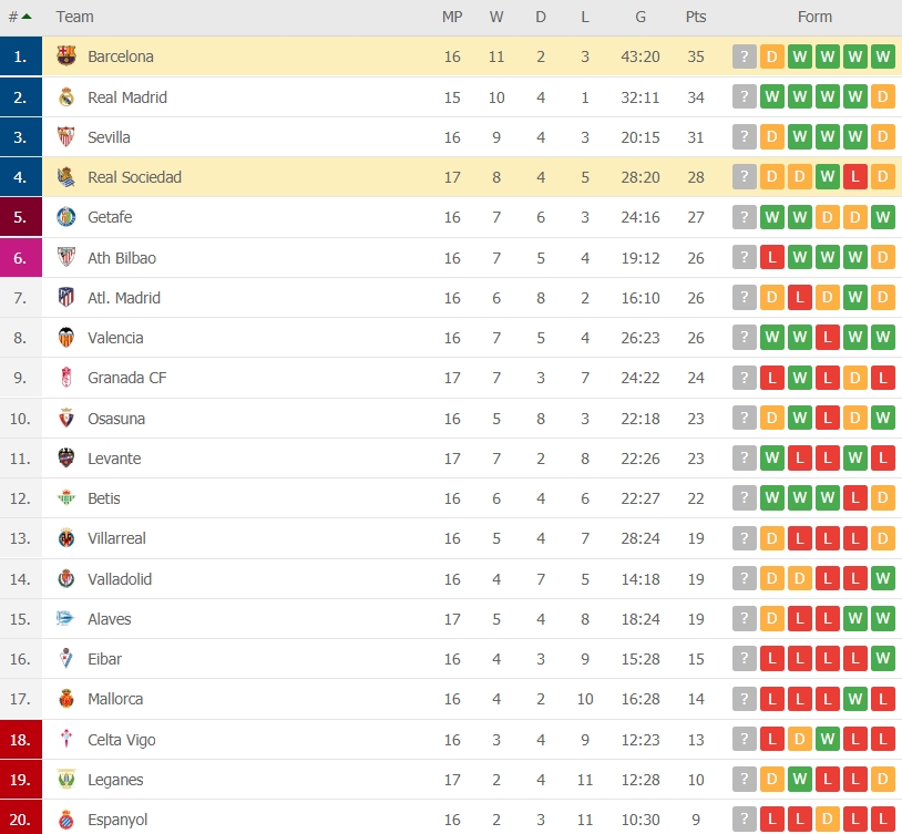 บาร์เซโลน่า บุกไปโดนนำก่อนจากจุดโทษของ มิเคล โอยาร์ซาบัล ก่อนจะพลิกแซงจากประตูของ อ็องตวน กรีซมันน์ และ หลุยส์ ซัวเรซ แต่สุดท้ายนาที 62 โดน อเล็กซานเดอร์ อิซาค ซัดส้มหล่นช่วย เรอัล โซเซียดัด ตีเสมอแบ่งแต้ม 2-2 ทำให้ต่างดาวมีเพิ่มเป็น 35 คะแนนจาก 16 นัด นำเป็นจ่าฝูงต่อไปแต่มีสิทธิ์โดนเรอัล มาดริดแซงนำเดี่ยว ขณะที่ลา เรอัล รั้งอันดับ 4 มี 28 แต้ม จาก 17 นัด