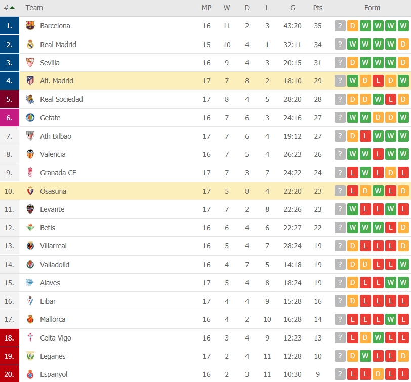 กลับมาเก็บชัยในลาลีก้าได้เสียทีสำหรับ แอตเลติโก้ มาดริด โดยเปิดบ้านกดโอซาซูน่า 2-0 โดยได้ในครึ่งหลังจากลูกโหม่งของ อัลบาโร่ โมราต้า และการยิงของ ซาอูล ทำให้พวกเขามีเพิ่มเป็น 29 คะแนนจาก 17 นัด กลับขึ้นไปอยู่ที่ 4 ของตาราง ตามหลังจ่าฝูงอย่างบาร์เซโลน่า 6 คะแนน แต่แข่งมากกว่า 1 นัด