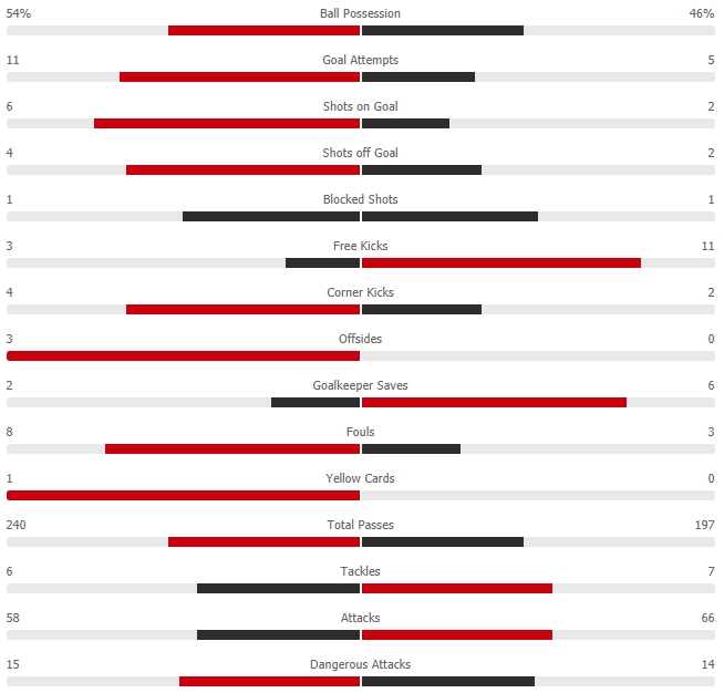 ทีมเยือนน่าได้ประตูขึ้นนำสุดๆ จังหวะที่เอสตูปิญานแทงบอลให้บราซานัชหลุดไปซัดด้วยซ้ายในกรอบฝั่งซ้าย บอลพุ่งเรียดไปที่เสาแรกแต่โอบลัคยังเซฟเอาไว้ได้