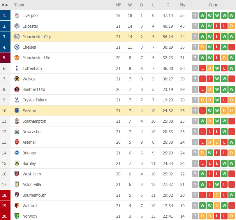แมนเชสเตอร์ ซิตี้ ได้สองประตูในครึ่งหลังจากการเหมาของ กาเบรียล เชซุส แต่มาปวดหัวกับความผิดพลาดของ เคลาดิโอ บราโว่ ที่ทำให้ ริชาร์ลิซอน ยิงตีไข่แตกให้เอฟเวอร์ตัน จนท้ายเกมมีเสียวนิดๆ แต่สุดท้ายปิดจ็อบเชือดชนะไป 2-1 เรือใบสีฟ้า เก็บเพิ่มเป็น 44 คะแนนจาก 21 นัด รั้งที่สามของตารางตามหลังจ่าฝูงลิเวอร์พูล 11 แต้มแต่แข่งมากกว่า 2 เกม ส่วนคาร์โล อันเชล็อตติ เสียซิงเป็นนัดแรกในการคุม ท๊อฟฟี่