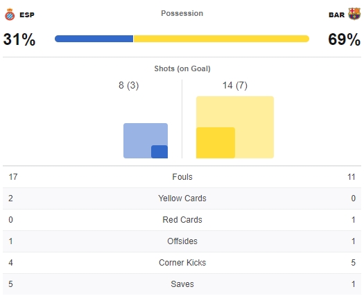 ต่างดาวครองบอลบุกเยอะกว่าชัดเจน แต่กลายเป็นว่าจบครึ่งแรกโดนเอสปันญอลนำอยู่ 1-0 โดยเป็นการโขกฟรีคิกของดาบิด โลเปซ บาร์ซ่านั้นมีโอกาสหลายครั้งในช่วงท้ายแต่ยังไม่คมพอ