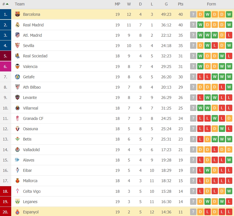 บาร์ซ่าโลน่า บุกไปโดนนำก่อนแล้วอุตส่าห์พลิกแซงได้จากการยิงของ หลุยส์ ซัวเรซ และ อาร์ตูโร่ วิดัล แต่ท้ายเกมเฟรงกี้ เดอ ยอง โดยเหลืองแดง ก่อนที่ทีมบ๊วยอย่างเอสปันญอลจะมาตีเสมอนาที 88 จากการซัดของตัวสำรองชาวจีนอย่าง หวู เล่ย เสมอ 2-2 แบ่งแต้ม ทีมต่างดาวยังนำเป็นจ่าฝูงลาลีก้าต่อไปแต่ก็มี 40 คะแนนเท่ากับเรอัล มาดริด หลังเตะไป 19 นัด