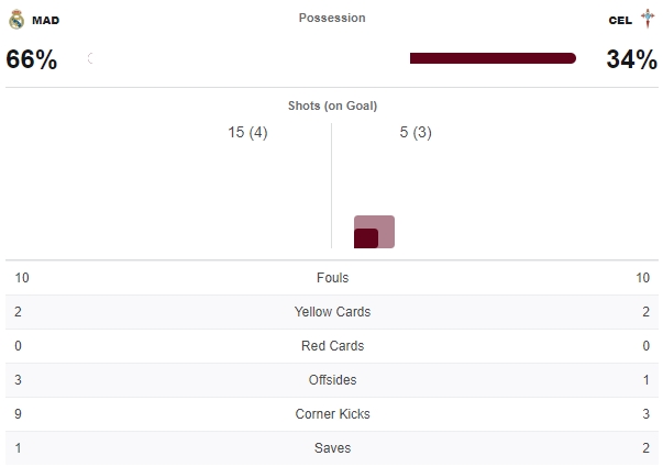 สุดท้ายจบครึ่งแรกเป็นเซลต้าพลิกล็อคขึ้นนำไปก่อนจากประตูต้นเกมของสโมลอฟ ฝั่งมาดริดนั้นครองบอลบุกมากกว่าแต่โอกาสเข้าทำยังไม่ชัดเจนและไม่คมพอ