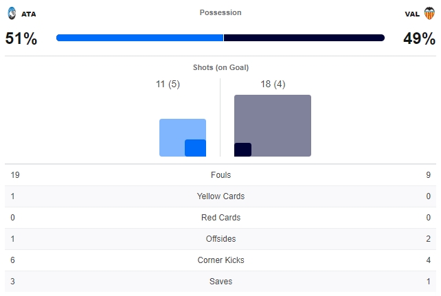จบครึ่งแรกเป็นเจ้าถิ่นอย่างอตาลันต้าที่เด็ดขานำไปก่อนถึงสองสกอร์ แต่ฝั่งบาเลนเซียก็ครองบอลและมีโอกาสตีไข่เหมือนกันแต่ไม่คมเอง