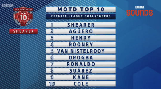 จากนั้นเป็น เวย์น รูนีย์, รุด ฟาน นิสเตลรอย, ดิดิเยร์ ดร็อกบา, คริสติอาโน่ โรนัลโด้, หลุยส์ ซัวเรซ, แฮร์รี่ เคน และ แอนดี้ โคล