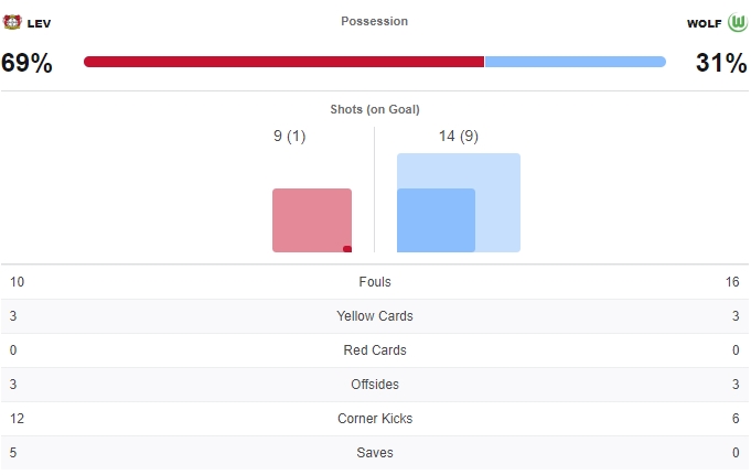 ครึ่งแรกเป็นโวล์ฟส์บวร์กที่ออกไปก่อน 1-0 จากลูกโขกท้ายเกมของพอนกราซิช ฝั่งเลเวอร์คูเซ่นนั้นครองบอลมากกว่าก็จริงแต่ยังหาช่องเจาะเข้าทำได้ไม่ดีเท่าที่ควร