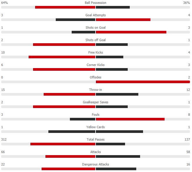 ห้างยาเกือบได้ประตูออกนำจากจังหวะที่ครองบอลขึงบุก เบลลาราบี้ได้บอลทางริมเส้นฝั่งซ้ายก่อนตักสวนเข้าไปในกรอบเขตโทษให้ฮาเวิร์ตซ์โฉบโหม่งตามน้ำบอลพุ่งตกหลังคาประตูไปแบบหวุดหวิด