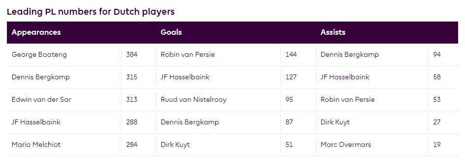 คือจำนวนของนักเตะดัชท์ทั้งหมดที่ได้เข้ามาเล่นใน EPL