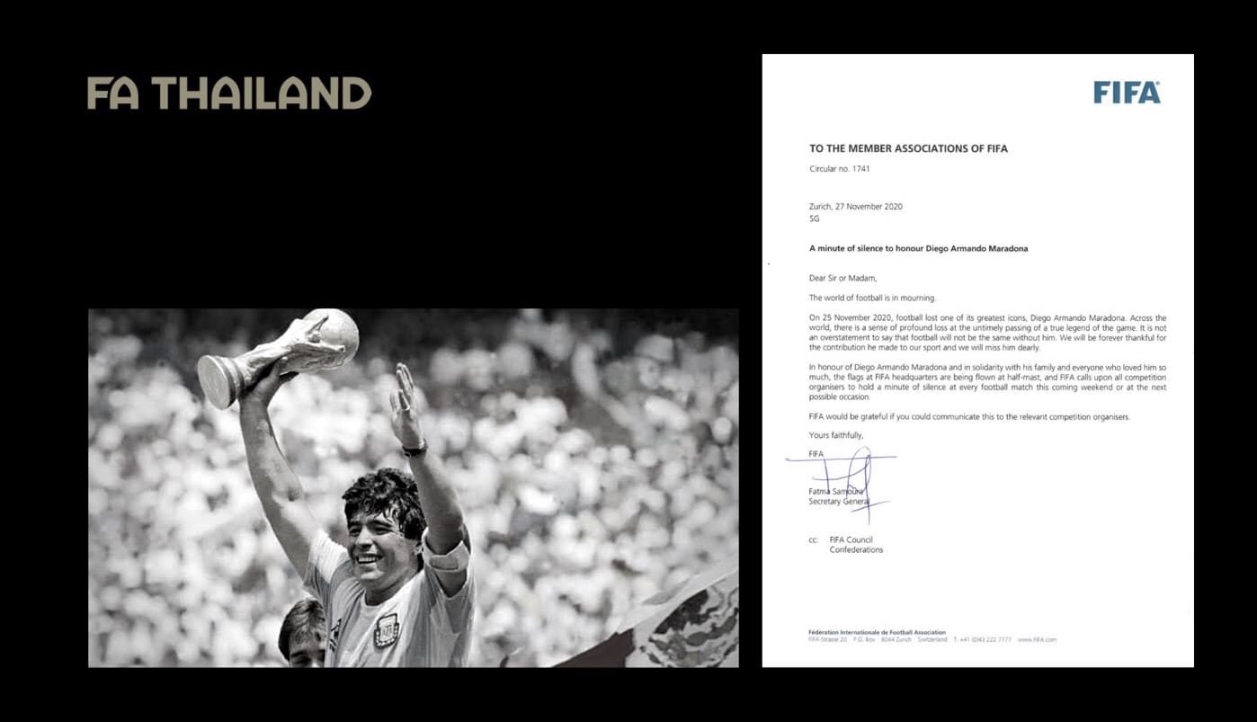 สหพันธ์ฟุตบอลนานาชาติ (ฟีฟ่า) ได้ส่งหนังสือขอความร่วมมือประเทศสมาชิก ให้มีการยืนไว้อาลัย ดีเอโก้ มาราโดนา ก่อนเริ่มเกมการแข่งขันในสุดสัปดาห์นี้