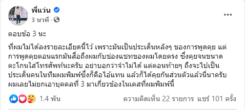 1.3 ผมเคยมีปัญหากับเขามาก่อนจริง แต่เป็นเรื่องที่แฟนเขาไลฟ์สดในเฟส แล้วตบน้องผู้หญิงคนนึง ก็ไปออกตัวปกป้องน้องเขา แต่ที่ปกป้องคืออย่าไปตบกัน ทำร้ายร่างกายก็คดีนึง ถ้าน้องเขาขโมยของก็อีกคดีนึง ถ้าน้องเขาขโมยก็แจ้งความเขาก็จบ