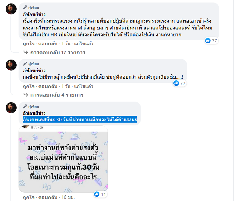 อย่างไรก็ตาม ต่อมา ทางแอดมินเพจ ก็ได้ระบุเพิ่มเติมอีกว่า “เรื่องจริงที่กระทรวงแรงงานไม่รู้ หลายที่บอกปฎิบัติตามกฎกระทรวงแรงงาน แต่พอเอาเข้าจริง แรงงานไทยหรือแรงงานทาส ตั้งกฎ บลาๆ สายคิดเป็นนาที แล้วแต่โปรของแต่ละที่ รับได้ไหม รับไม่ได้เชิญ HR เป็นใหญ่ มันจะมีใครจะรับไม่ได้ ชีวิตต้องใช้เงิน งานก็หายาก”