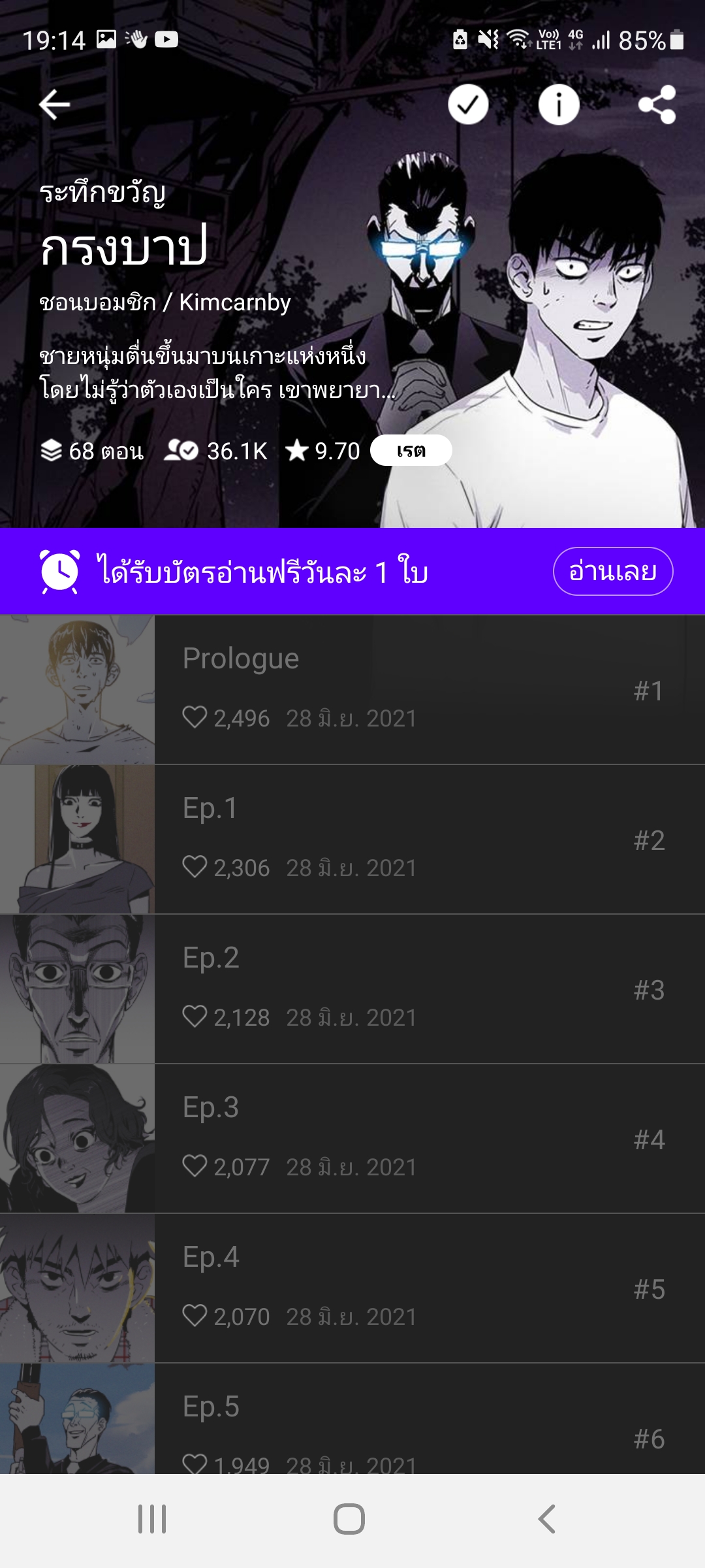 kakao กั๊กไปหน่อย ถึงจะถูก ตอนล่ะ 5 บาท แต่ว่ามีอายุแค่ 1 ปี มีล่าสุดแค่ Solo Leveling