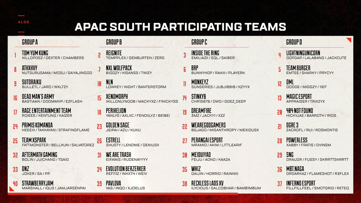 รายละเอียด: https://liquipedia.net/apexlegends/Apex_Legends_Global_Series/2021/Split_1/Pro_League/APAC_South