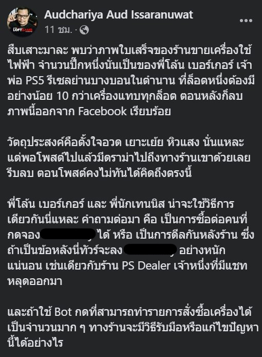 เมื่อไม่นานมานี้ผู้ใช้เฟซบุ๊ก Audchariya Aud Issaranuwat ได้ออกมาพูดถึงประเด็นดราม่า เมื่อมีพ่อค้ารีเซลล์รายหนึ่งเป็นเจ้าของเครื่อง PS5 จากร้านขายเครื่องใช้ไฟฟ้าชื่อดังคนเดียวกว่า 10 เครื่อง จากโพสต์ดังกล่าวได้มีการโพสต์ภาพใบเสร็จของร้านขายเครื่องใช้ไฟฟ้าดังกล่าว โดยระบุว่าภาพดังกล่าวมาจากพ่อค้ารีเซลล์ PS5 รายหนึ่งที่โพสต์ในเฟซบุ๊กของตน ก่อนที่จะลบภาพดังกล่าวออกไป