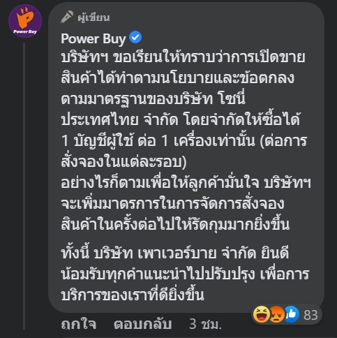ล่าสุดทาง Power Buy ร้านขายเครื่องใช้ไฟฟ้าที่ถูกพาดพิงได้ออกมาชี้แจงปประเด็นดังกล่าวผ่านคอมเมนต์ โดยระบุว่าทางร้านได้เปิดการขายตามนโยบายที่ตกลงกับทาง Sony มีการจำกัดการซื้อ 1 คนต่อ 1 ชิ้น และน้อมรับทุกคำแนะนำเพื่อไปปรับปรุงบริการให้ดียิ่งขึ้น