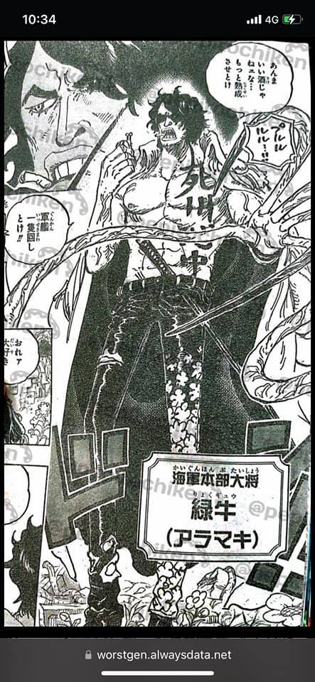 - พลเรือเอกเรียวคุกิว (กระทิงเขียว) มีชื่อจริงว่า "อารามากิ" ภาพลักษณ์ดูดิบเถื่อน กางเกงหนัง ไม่ใส่เสื้อ มีรอยสัก ใส่แว่นดำ เหน็บดาบ