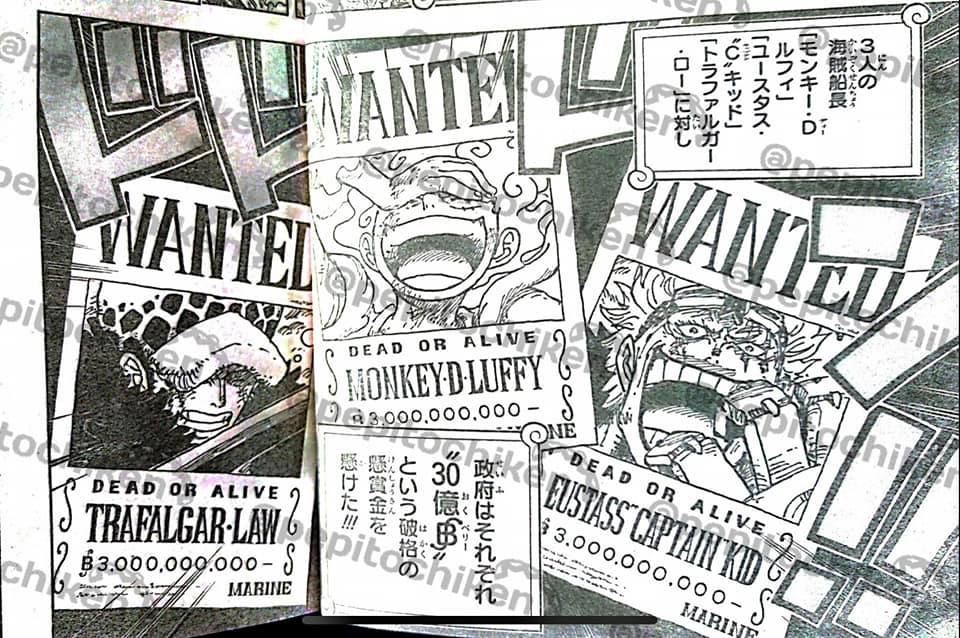 - เปิดเผยค่าหัวใหม่ของลูฟี่ คิด ลอว์ ทั้งสามคนได้ค่าหัวสามพันล้านเท่ากันหมด รวมถึงรูปในใบประกาศจับ ก็อัปเดตใหม่หมด