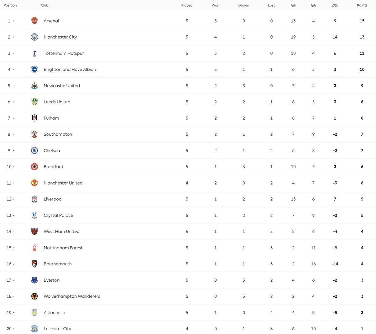 อาร์เซนล ยังคงรักษาโครงการชนะรวดเอาไว้ได้ เมื่อพวกเขาเปิดบ้านเฉือนเอาชนะทีมฟอร์มห่วยอย่าง แอสตัน วิลล่า ไปหวุดหวิด 2-1 โดยได้ประตูขึ้นนำในครึ่งแรกจาก กาเบรียล เชซุส แม้ครึ่งหลังจะโดนตีเสมอจากจังหวะที่ ดักลาส ลุยซ์ ปั่นเตะมุมเข้า แต่สุดท้ายเป็น กาเบรียล มาร์ติเนลลี่ มาซัดประตูชัย ทำให้ทีมปืนใหญ่ชนะ 5 นัดติด นำจ่าฝูงพรีเมียร์ลีกต่อไปด้วยการมี 15 คะแนนเต็ม