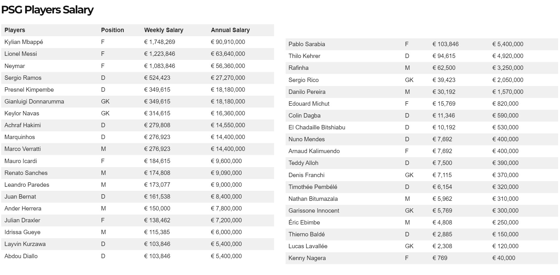 สงสัย psg มากกว่าเอาเงินจากไหนมาจ่ายเงินเดือน เกินครึ่งทีมได้ค่าจ้าง 100000 ยูโรขึ้นไป นี่คือค่าจ้างระดับหัวแถวของสตาร์ทีมอื่นๆ