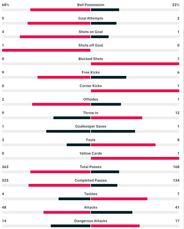 ท้ายครึงแรกบิลเบามาได้โอกาสยิงตรงกรอบครั้งแรก จากจังหวะที่ตัดบอลได้แล้วทำเร็ว เบเรนเกร์ลากบอลมาที่หน้ากรอบเขตโทษฝั่งซ้ายก่อนปั่นด้วยขวาแฉลบแต่ก็พุ่งไปติดเซฟสเตเก้น