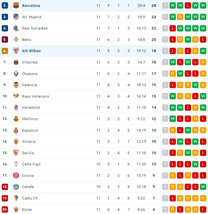 บาร์เซโลน่่า ฟอร์มดุอีกนัดเมื่อเปิดบ้านถล่มใส่ แอธเลติก บิลเบา 4-0 โดยได้ อุสมาน เดมเบเล่ ยิงขึ้นนำตั้งแต่นาที 12 ก่อนที่หลังจากนั้นเขาจะแอสซิสต์ 3 ลูกให้ทั้ง เซร์กี้ โรเบร์โต้, โรเบิร์ต เลวานดอฟสกี้ และ เฟร์ราน ตอร์เรส ทำให้ทีมเจ้าบุญโยกเก็บเพิ่มเป็น 28 คะแนนจาก 11 นัด รั้งรองจ่าฝูงลาลีก้า ตามหลังเรอัล มาดริด 3 แต้มต่อไป
