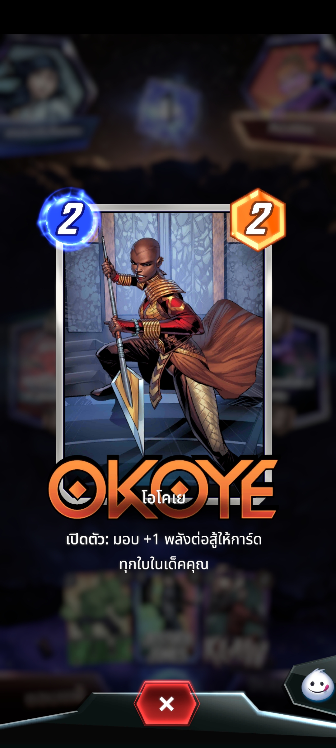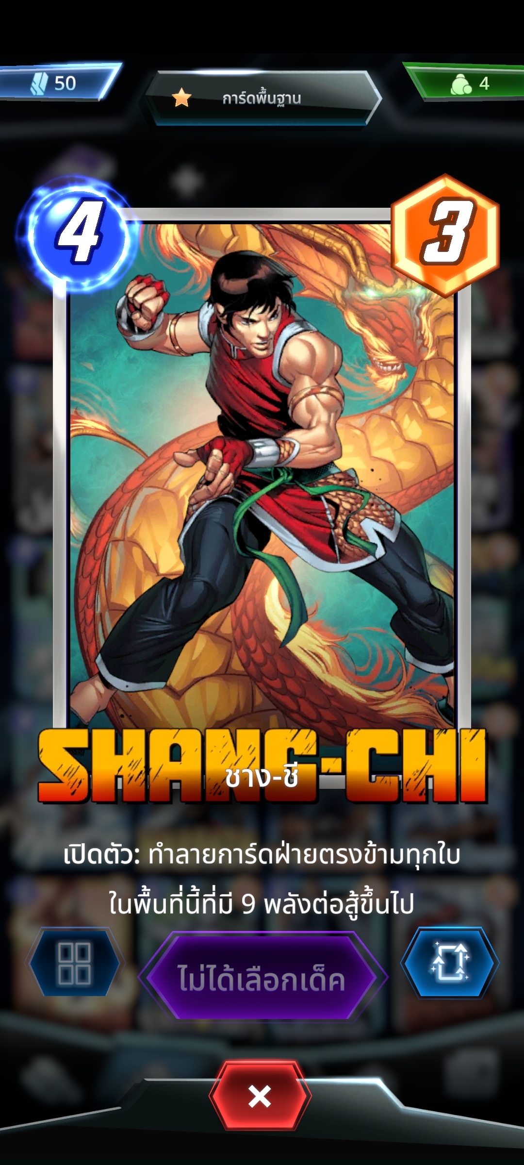การ์ดที่ดีอีกใบคือ Shang-chi ครับ ผมแนะนำให้ติดสักใบนะ เพราะการ์ดนี้ทำลายการ์ดที่มีพลังโจมตี 9 ขึ้นไป พลังโจมตี 9 ในที่นี้รวมกับพวกผลของการ์ดต่างๆหรือพื้นที่ด้วยนะ เอาง่ายๆ แค่มีพลังโจมตี 9 ทำลายได้หมด ต่อให้พื้นฐานของการ์ดไม่ใช่โจมตี 9 ก็ตาม ผมลองมาละ
