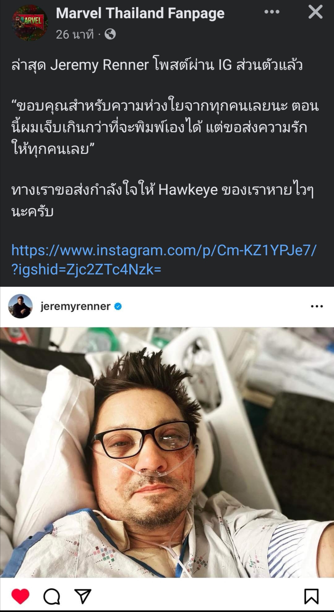 [RE: อัพเดพอาการ Jeremy Renner (Hawkeye) ล่าสุด!!]