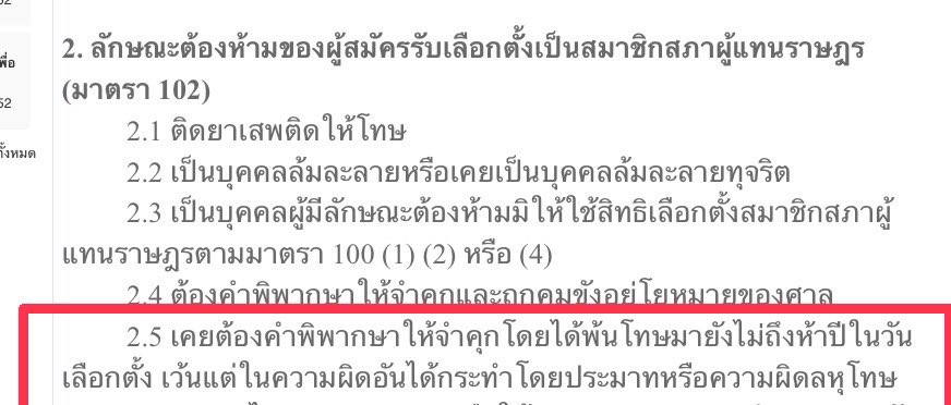 ในรัฐธรรมนูญ มาตรา 98 บุคคลผู้มีลักษณะดังต่อไปนี้เป็นบุคคลต้องห้ามมิให้ใช้สิทธิสมัครรับเลือกตั้งเป็นสมาชิกสภาผู้แทนราษฎร