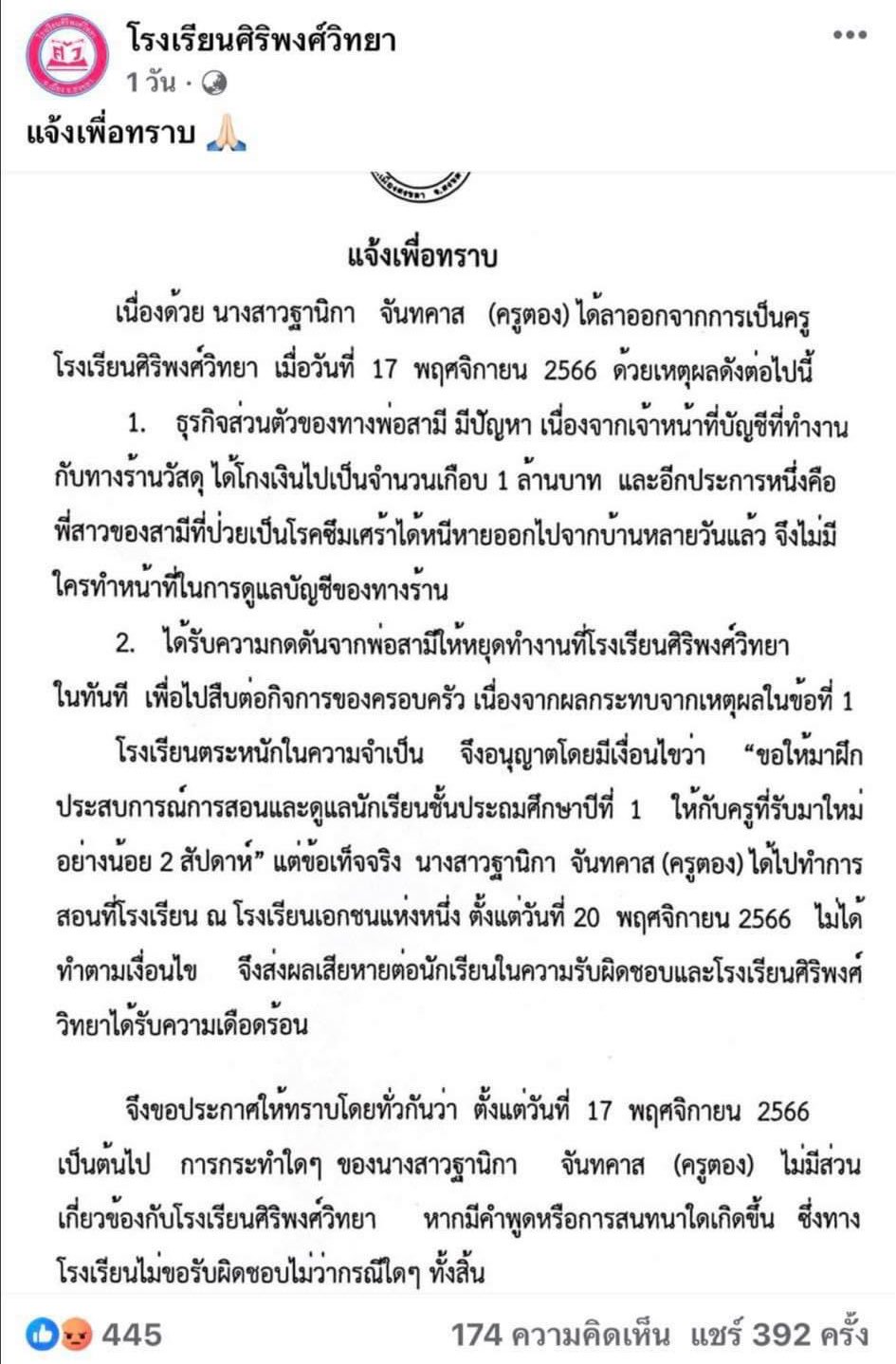 ดราม่า ครูลาออก รร.ศิริพงศ์วิทยา