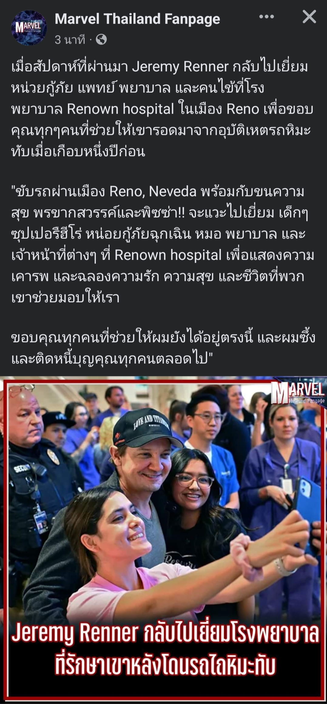 [RE: Jeremy Renner กลับไปเยี่ยมโรงพยายาลที่รักษาเขาหลังโดนรถไถหิมะ]