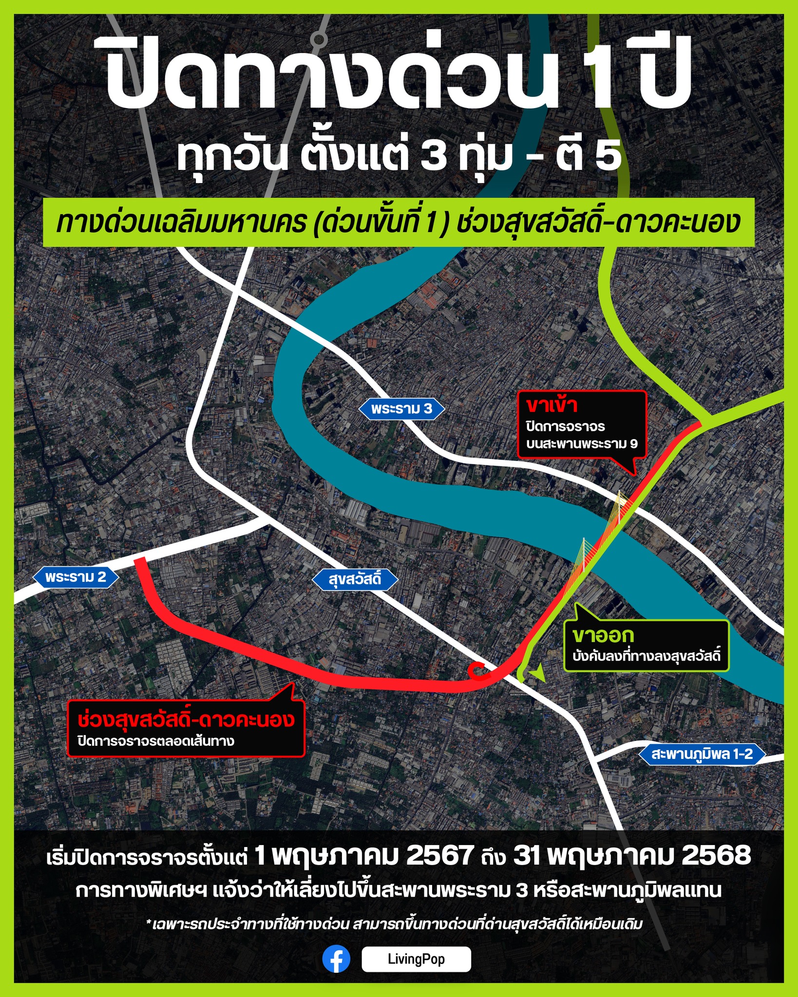 ปิดทางด่วนเฉลิมมหานคร ช่วงสุขสวัสดิ์-ดาวคะนอง ทุกวันตั้งแต่ 21:00 - 5:00 เริ่ม 1 พฤษภาคม 2567 ถึง 31 พฤษภาคม 2568 (1 ปี 1 เดือน)