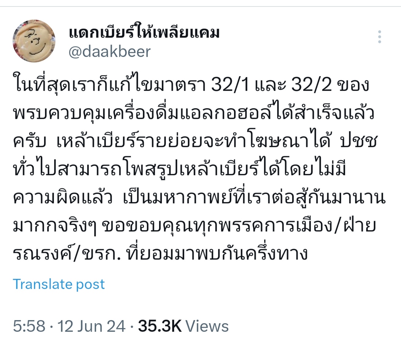 [RE: ประชาชนคนทั่วไปใกล้จะโพสรูปกินเบียร์ลงใน social ตัวเองได้แล้ว ไม่ต้องโดนปรับ 50,000 บาท]