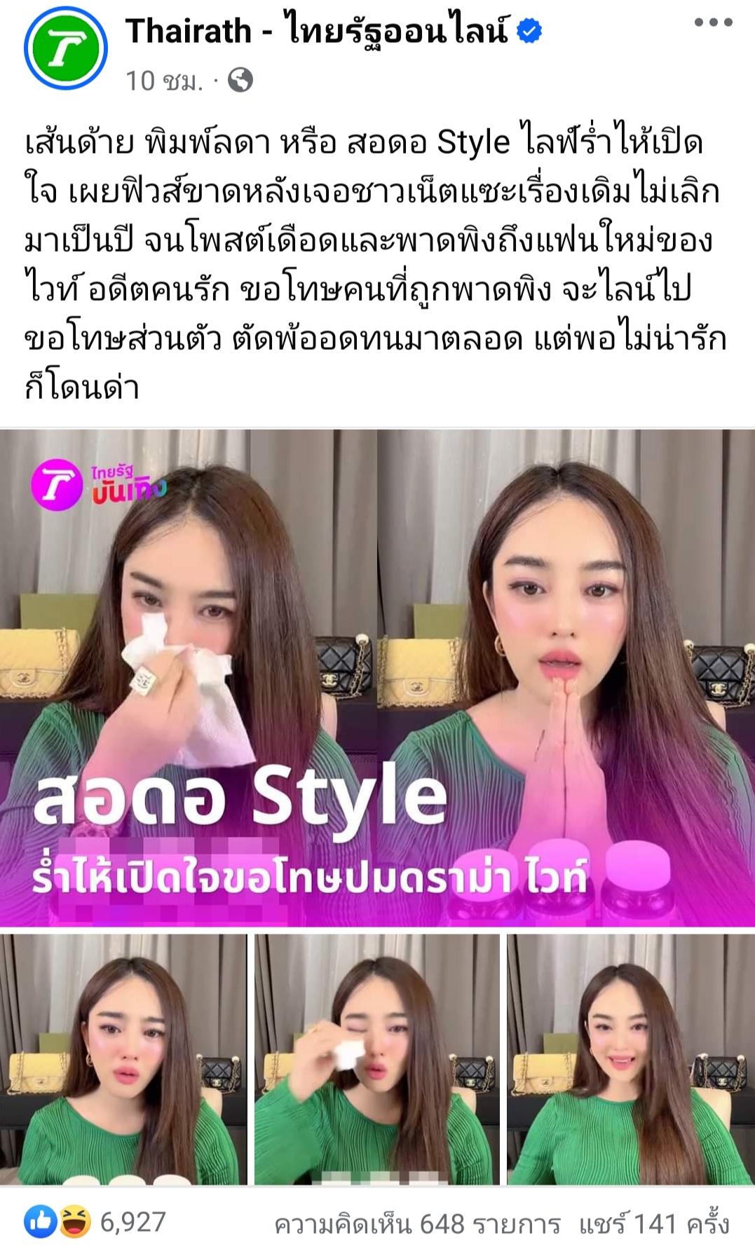 [RE: สอดอ Style เปิดใจไลฟ์สดทั้งน้ำตา หลังถูกชาวเน็ตแซะไม่เลิกจนไปพาดพิงแฟนใหม่ ไวท์ แฟนเก่า พร้อมขอโทษแฟนใหม่ไวท์ผ่าน Line แล้ว]