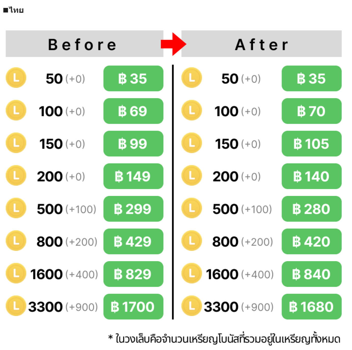 * การปรับราคาจำหน่ายเหรียญ LINE Coins อาจใช้เวลาสักครู่จึงแสดงผลในหน้าจำหน่ายเหรียญ LINE Coins.