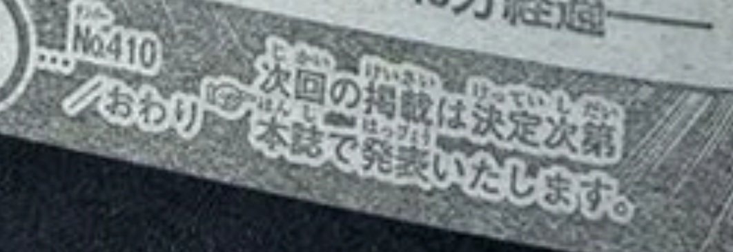 ก็ตามที่คาดครับ แต่รอบนี้ไม่น่าจะรอนานมาก เพราะต้นฉบับตอน 411-420 ตัดเส้นเรียบร้อยแล้ว เหลือแค่อยู่ในกระบวนการวาดฉาก ตกแต่งเท่านั้น