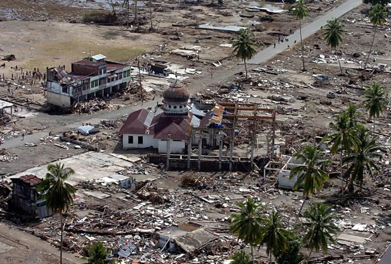 นี่คือสภาพถูกบันทึกภาพไว้หลังจากคลื่นยักษ์สึนามิพัดถล่มพื้นที่ จ.บันดาอาเจะห์ ของอินโดนีเซีย ไปแล้ว 7 วัน มัสยิดยังคงรายล้อมไปด้วยเศษซากปรักหักพังของบ้านเรือนสิ่งปลูกสร้างที่ถูกทำลายจากคลื่นยักษ์