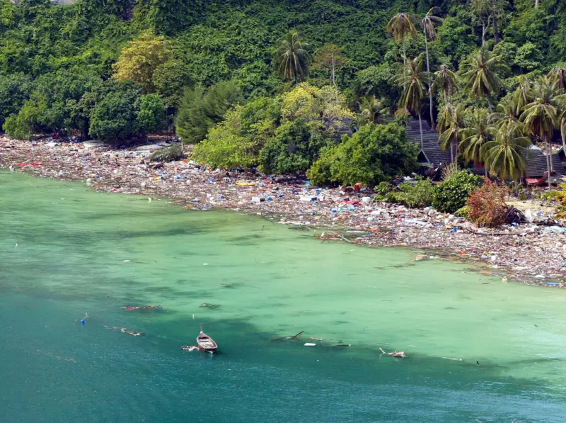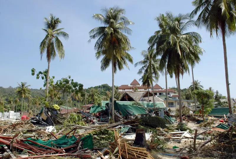 ส่วนภาพนี้ คือสภาพความเสียหายบนเกาะพีพี 1 วันหลังจากถูกสึนามิพัดถล่ม เกาะพีพี ถือเป็นปลายทางของนักท่องเที่ยวต่างชาติที่ต้องการมาพักผ่อนในช่วงเทศกาลคริสต์มาส (ภาพนี้บันทึกเมื่อวันที่ 27 ธ.ค. 2547)