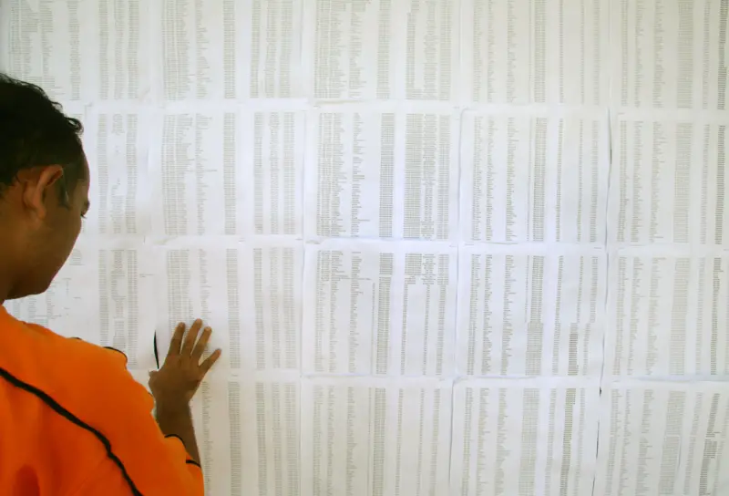 คนไทยรายหนึ่งกำลังไล่ดูรายชื่อของผู้เสียชีวิตที่ติดประกาศภายในศูนย์ช่วยเหลือผู้ประสบภัยสึนามิใน จ.ภูเก็ต โดยหวังว่าจะเห็นรายชื่อของญาติของเขา (ภาพถ่ายวันที่ 31 ธ.ค. 2547)