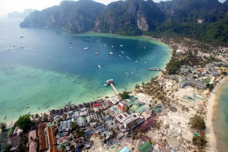 ภาพถ่ายทางอากาศเหนือเกาะพีพีที่บันทึกไว้ในวันที่ 29 ธ.ค. 2547 แม้ว่าจะผ่านเหตุการณ์สึนามิยักษ์พัดถล่มไปแล้ว 3 วัน ซากความเสียหายยังคงเกลื่อนริมหาด