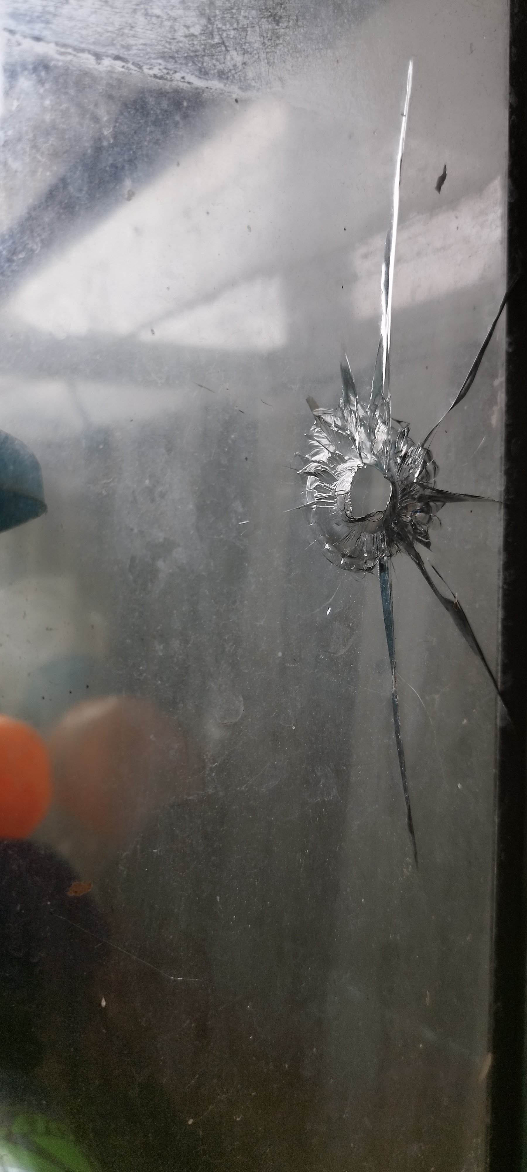 แต่ถ้าตามเหตุการณ์ที่ท่านว่า คือกระจกตู้ปลาตั้งอยู่กับที่ แล้วเจอรอยแบบนี้ในบ้านเนี่ย โอกาสน้อยมากที่จะไม่ใช่กระสุนปืนครับ ผมนึกเหตุการณ์ที่จะเป็นอย่างอื่นไม่ค่อยออกเลย เพราะความเร็วที่ต้องใช้มันค่อนข้างสูง ยากที่จะเป็นอุบัติเหตุ โดยเฉพาะในพื้นที่ปิด