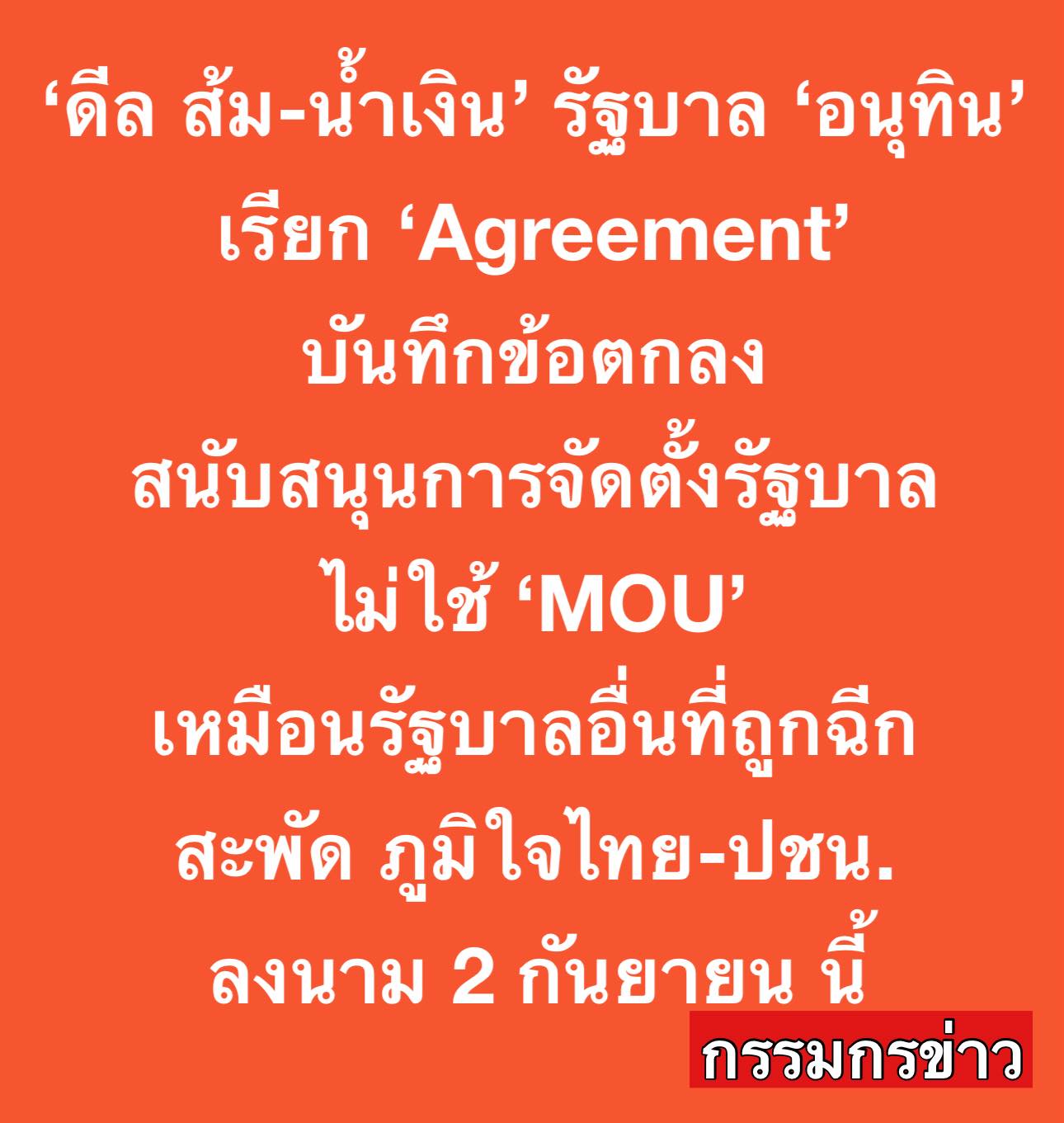 ‘ดีล ส้ม-น้ำเงิน‘ รัฐบาล ’อนุทิน‘ เรียก ’Agreement‘ บันทึกข้อตกลงสนับสนุนการจัดตั้งรัฐบาล ไม่ใช้ ’MOU‘ เหมือนรัฐบาลอื่นที่ถูกฉีก สะพัด ภูมิใจไทย-พรรคประชาชน ลงนาม 2 กันยายน นี้