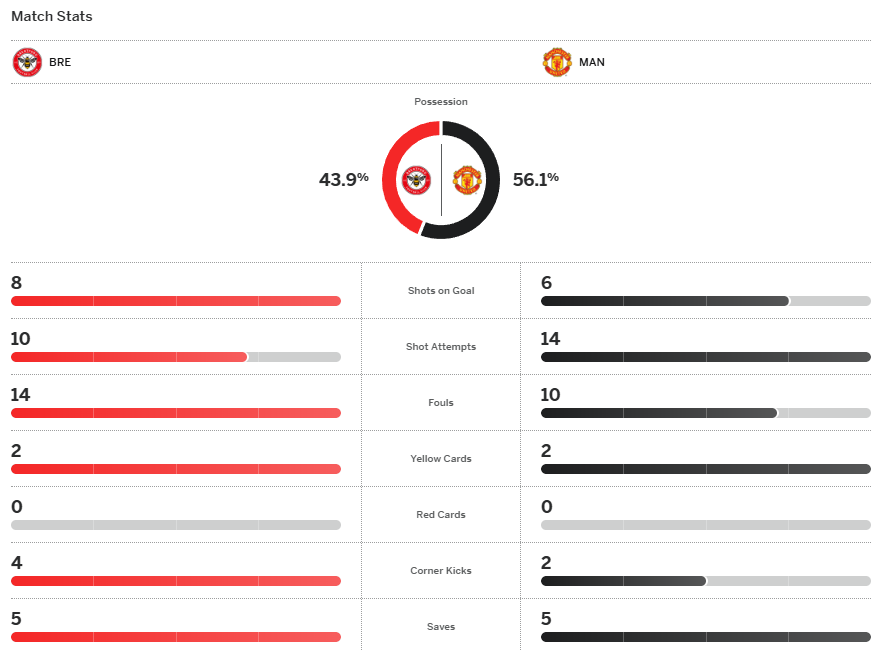 แมนเชสเตอร์ ยูไนเต็ด ต้องพบกับความผิดหวังอีกแล้วหลังจากโดน อิกอร์ ธิอาโก้ ซัดเบิ้ลทำให้ เบรนท์ฟอร์ด นำห่างก่อนที่ เบนยามิน เชชโก้ จะยิงตุงแรกให้ตัวเองพาทีมตีไข่แตกไล่มา กระนั้น บรูโน่ แฟร์นานเดส ดันพลาดจุดโทษยิงไปโดนเซฟแถมถูกตอกฝาโลงทดเจ็บอีก ปีศาจแดง พ่ายต่อ ผึ้งพิฆาต 3-1 เป็นความพ่ายแพ้นัดที่ 3 ในพรีเมียร์ลีกฤดูกาลนี้