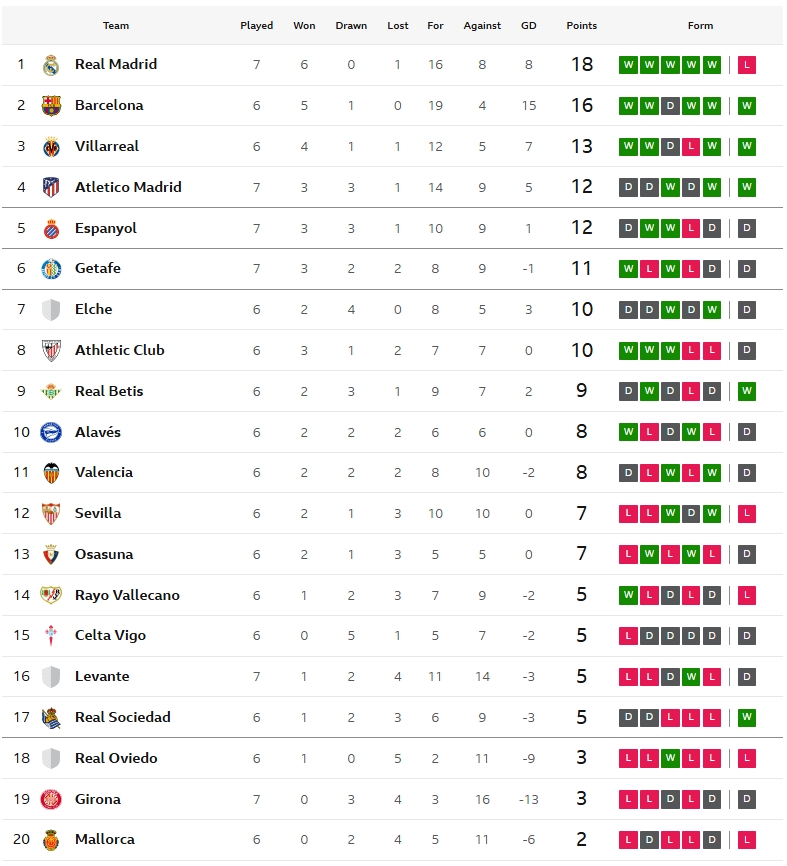 ส่วน เรอัล มาดริด ยังนำจ่าฝูง แพ้นัดแรกของฤดูกาล มี 18 แต้ม แต่เสี่ยงโดน บารืเซโลน่า แซงหากชนะได้ในวันพรุ่งนี้