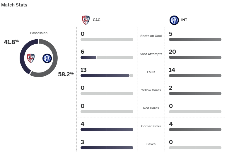 อินเตอร์ มิลาน ไม่พลาดในการเก็บ 3 คะแนน หลังบุกเอาชนะ กาญารี่ ไปด้วยสกอร์ 2-0 จากการทำประตูของ เลาตาโร่ มาร์ติเนซ ตั้งแต่นาทีที่ 9 และอีกลูกจาก ฟรานเชสโก้ ปิโอ เอสโปซิโต้ นาที 82