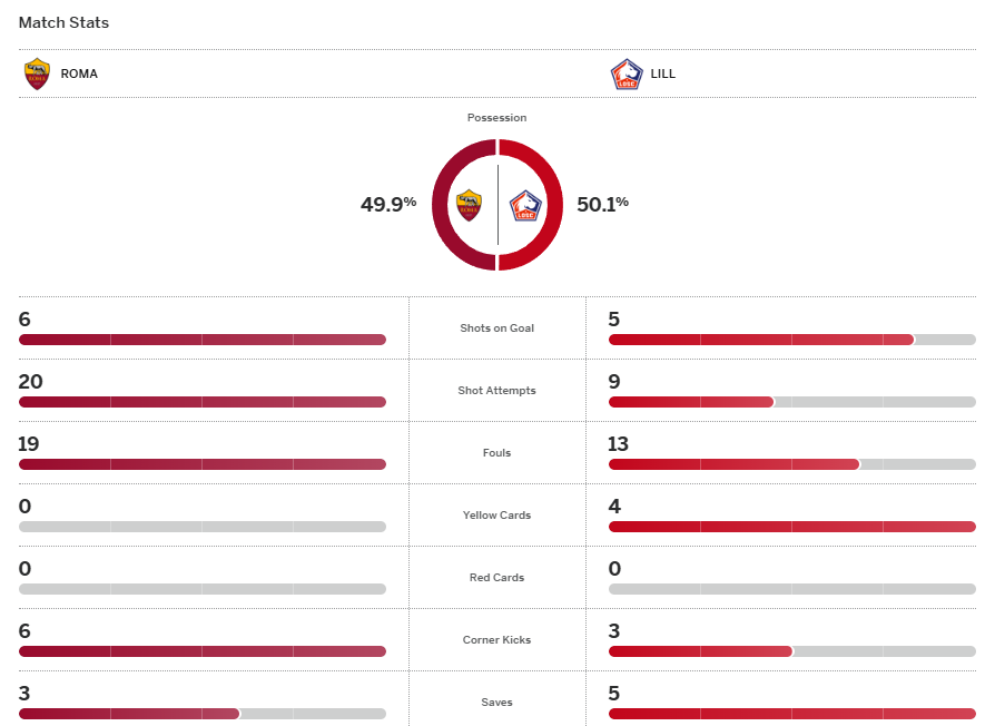 ไม่เชื่อก็ต้องเชื่อหลัง โรม่า โดนนำตั้งแต่นาทีที่ 6 แต่ควานหาประตูเท่าไหร่ก็ไม่เจอจนกระทั่งท้ายเกมได้จุดโทษ อาร์เต็ม ดอฟบีค ยิงติดเซฟแต่เปาให้กลับมายิงใหม่ ดอฟบีค คนเดิมซัดติดเซฟอีกก่อนที่เปาให้ยิงใหม่รอบสาม มาติอัส ซูเล่ เปลี่ยนมายิงแทนแต่ก็โดนเซฟเหมือนเดิมทำให้ หมาป่ากรุงโรม พ่าย ลีลล์ คาบ้าน 1-0